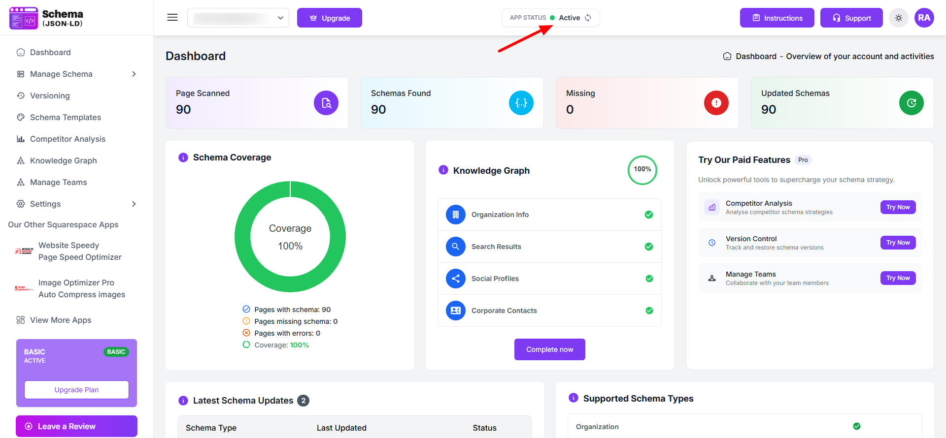 Step 2: Once you’re on the dashboard, check your website status. If it shows Active, it means the schema is successfully applied and working on your store.