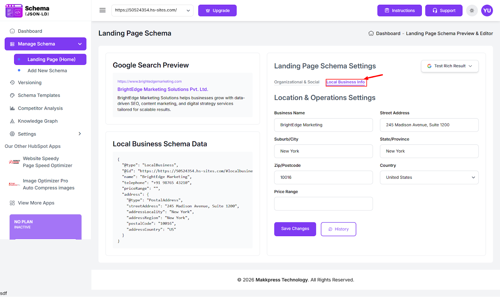 Go to Manage Schema → Local Business and fill in your business details, including address, city, country, postal code, and opening hours. Once done, save your settings.