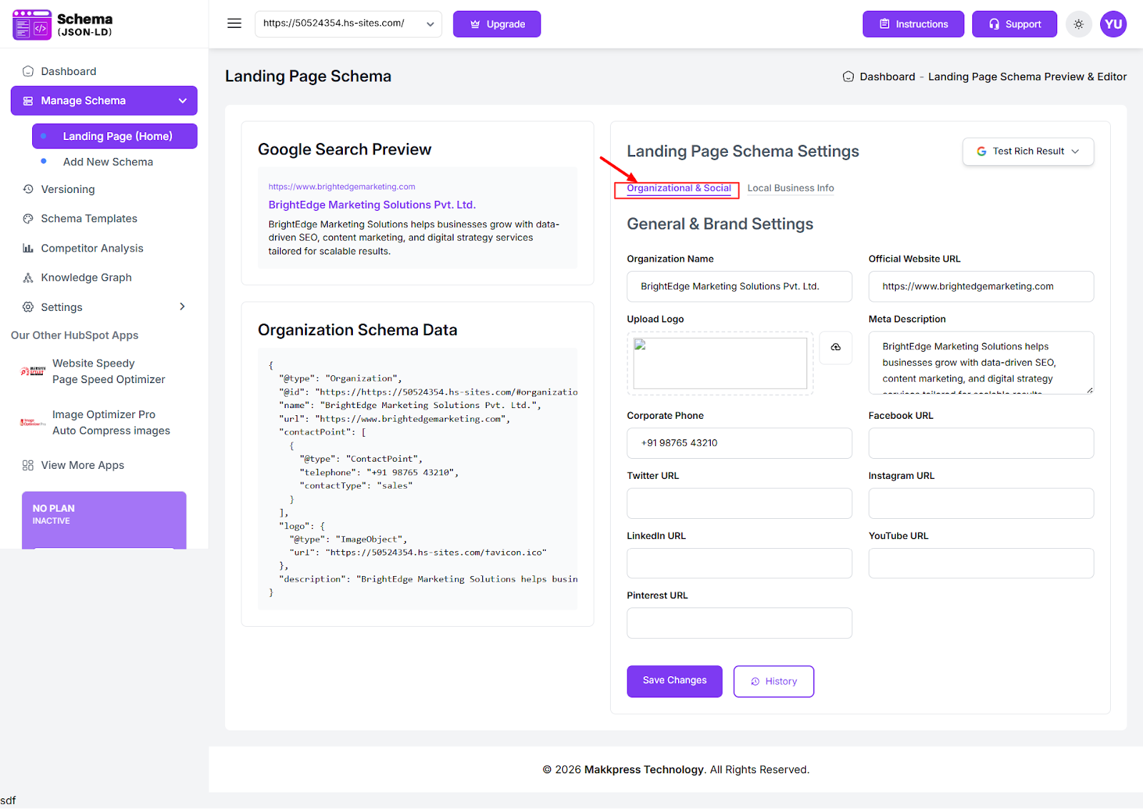 From your JSON Schema App dashboard, navigate to Manage Schema → Landing Page (Home). Enter your organization details such as organization name, logo, website URL, contact information, and social profiles, then click Save.