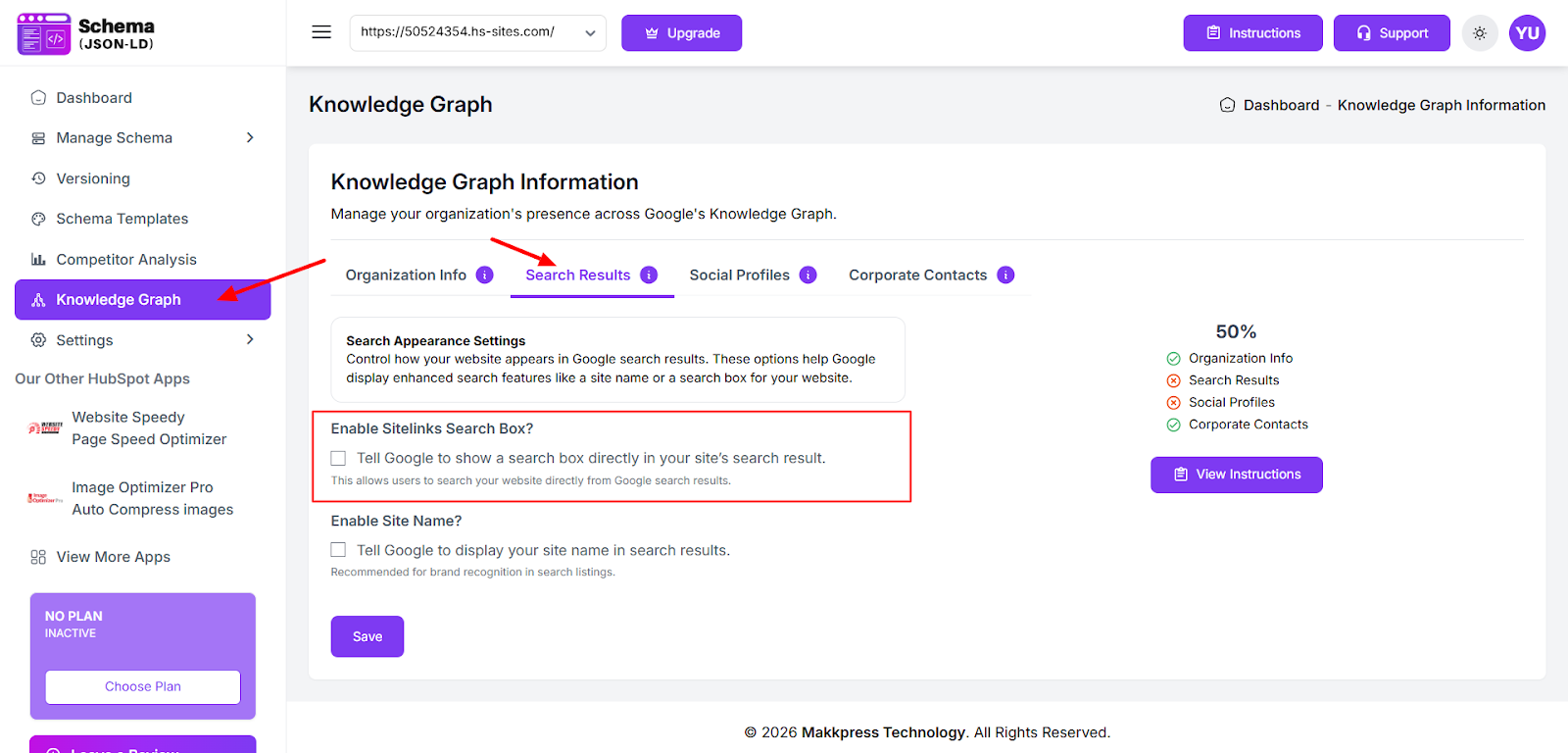 Navigate to the Knowledge Graph / Search Results section and enable the Sitelinks Search Box option. Click Save to apply the changes.