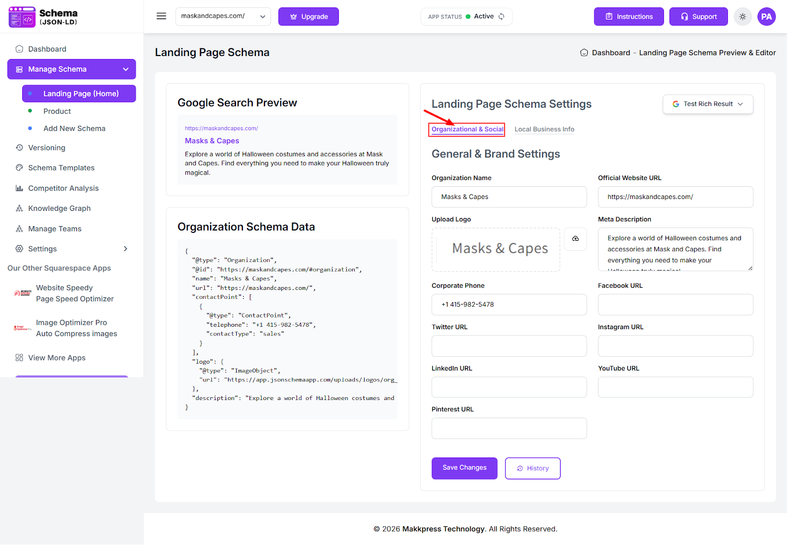 Go to Manage Schema → Landing Page (Home). Enter your organization details such as organization name, logo, website URL, contact information, and social profiles, then click Save.