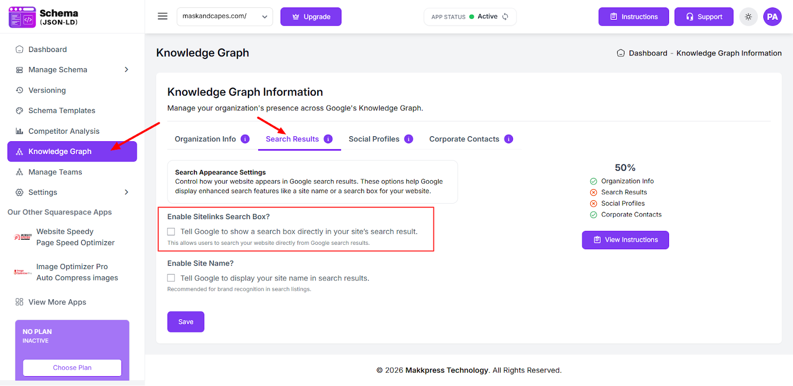 Under the Knowledge Graph tab, go to the Search Results section and enable the Sitelinks Search Box option. Then click Save to apply the changes.