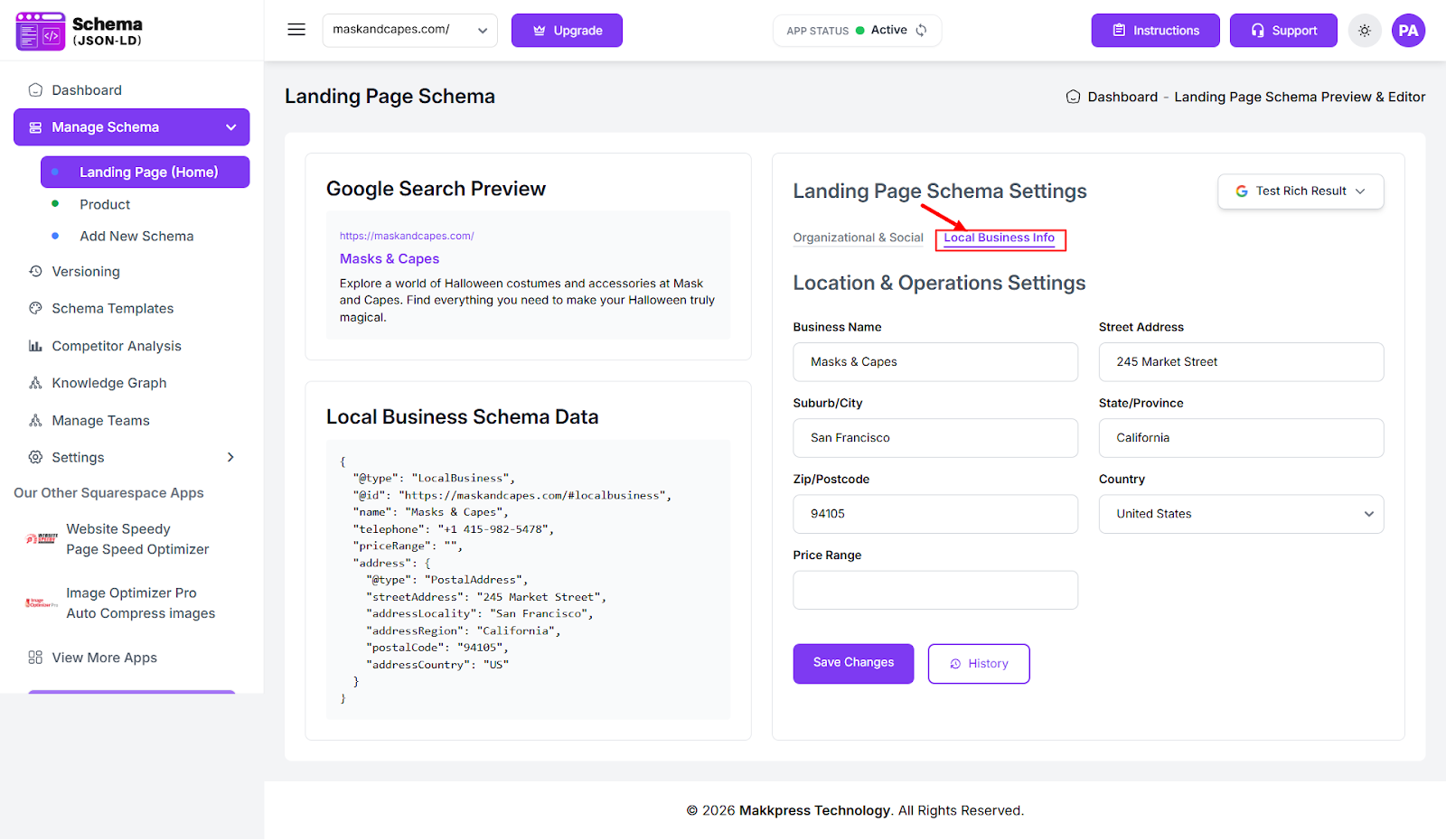 Navigate to Manage Schema → Landing Page (Home). Under the Local Business Info tab, fill in your business details, including address, city, country, postal code, and opening hours, then click Save to apply your settings.