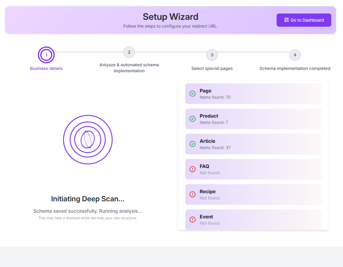 Step 10: The tool will begin a deep scan of your website to detect pages and automatically implement the appropriate schema types