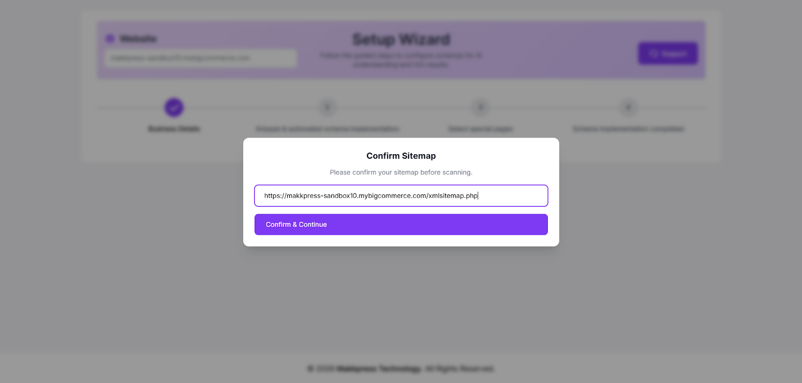 Step 9: Confirm your website sitemap URL and click “Confirm & Continue” to allow the tool to scan your site and set up the schema automatically.
