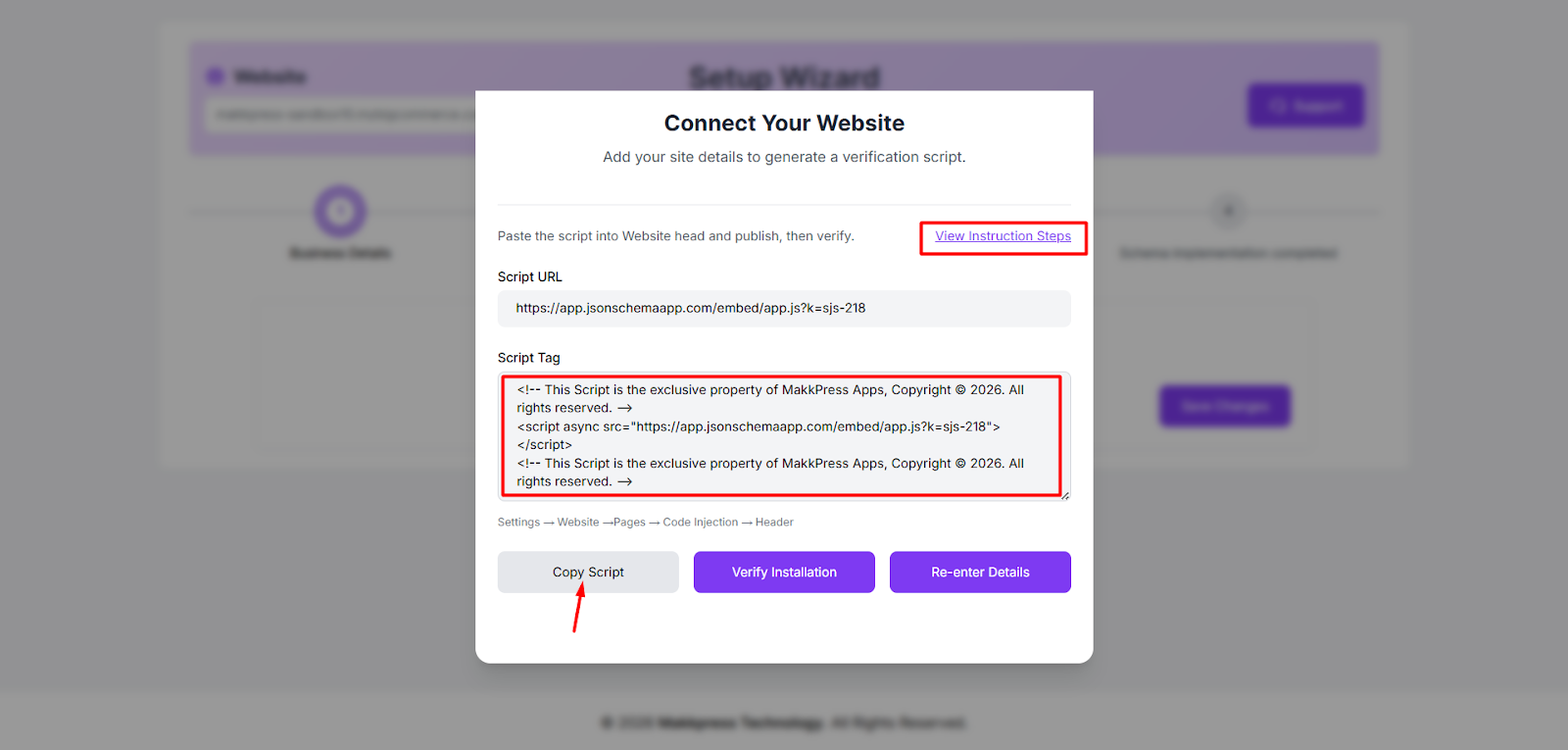 Step 4: In the Setup Wizard, copy the generated script tag by clicking “Copy Script.” This script will be added to your BigCommerce store to enable the JSON Schema App .