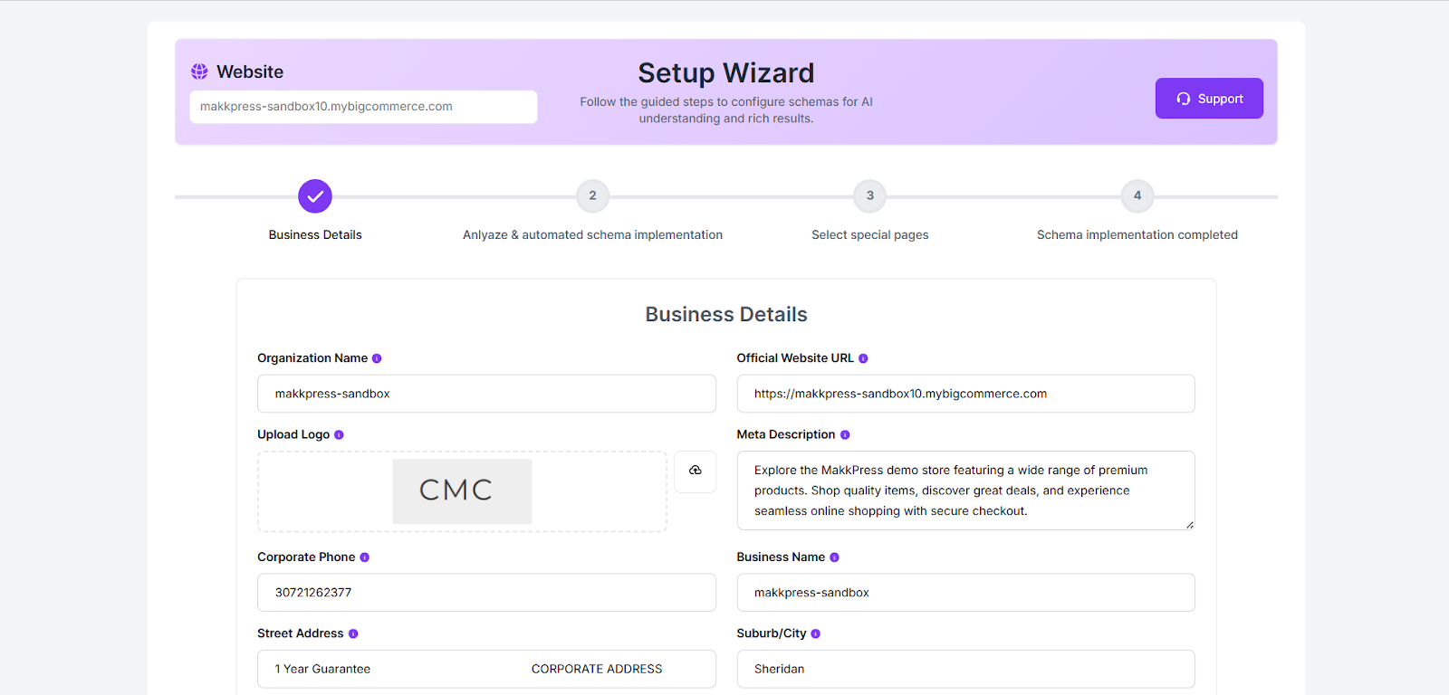Step 8: Complete the Setup Wizard by entering your business details such as organization name, website URL, logo, description, and contact information. Then proceed to configure your schema settings.