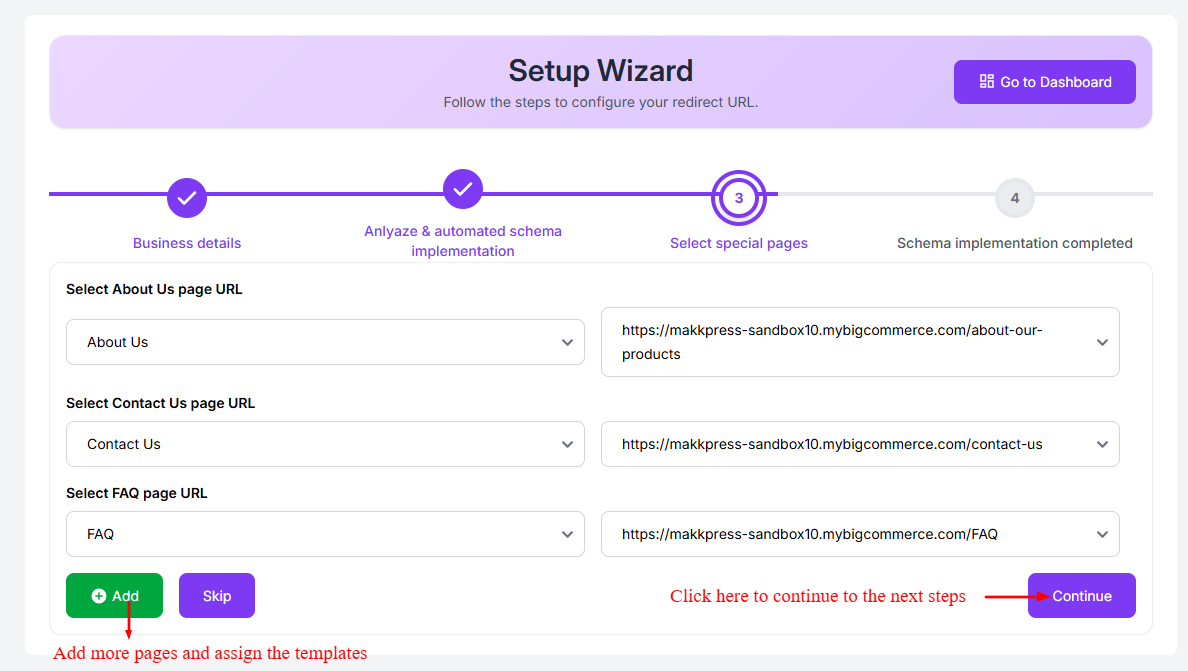 Step 12: Select the URLs for important pages such as About Us, Contact Us, and FAQ from the dropdown menus. If needed, you can add more pages by clicking Add. Once selected, click “Continue” to proceed to the final step.