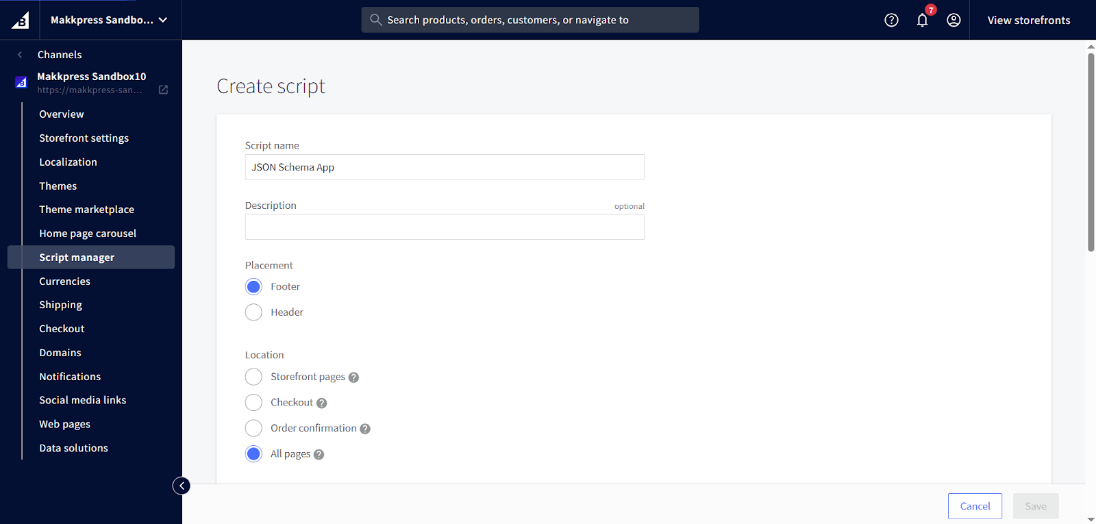 Step 5: Log in to your BigCommerce Admin Dashboard, go to Storefront Settings → Script Manager, and click “Create a Script.”