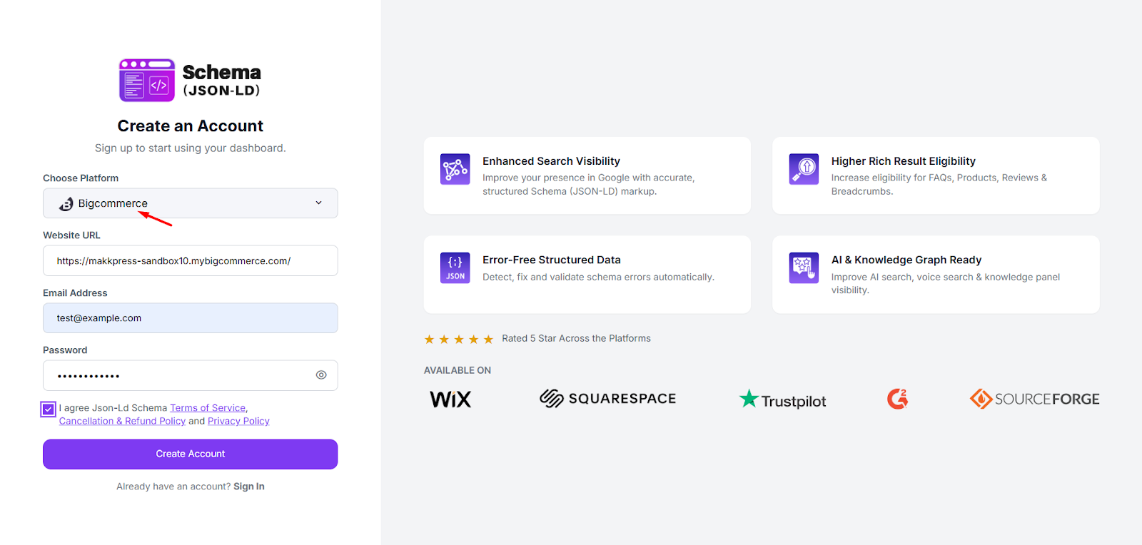 Step 2: Select BigCommerce as your platform, enter your website URL, email address, and create a password. Accept the terms and click “Create Account” to continue.
