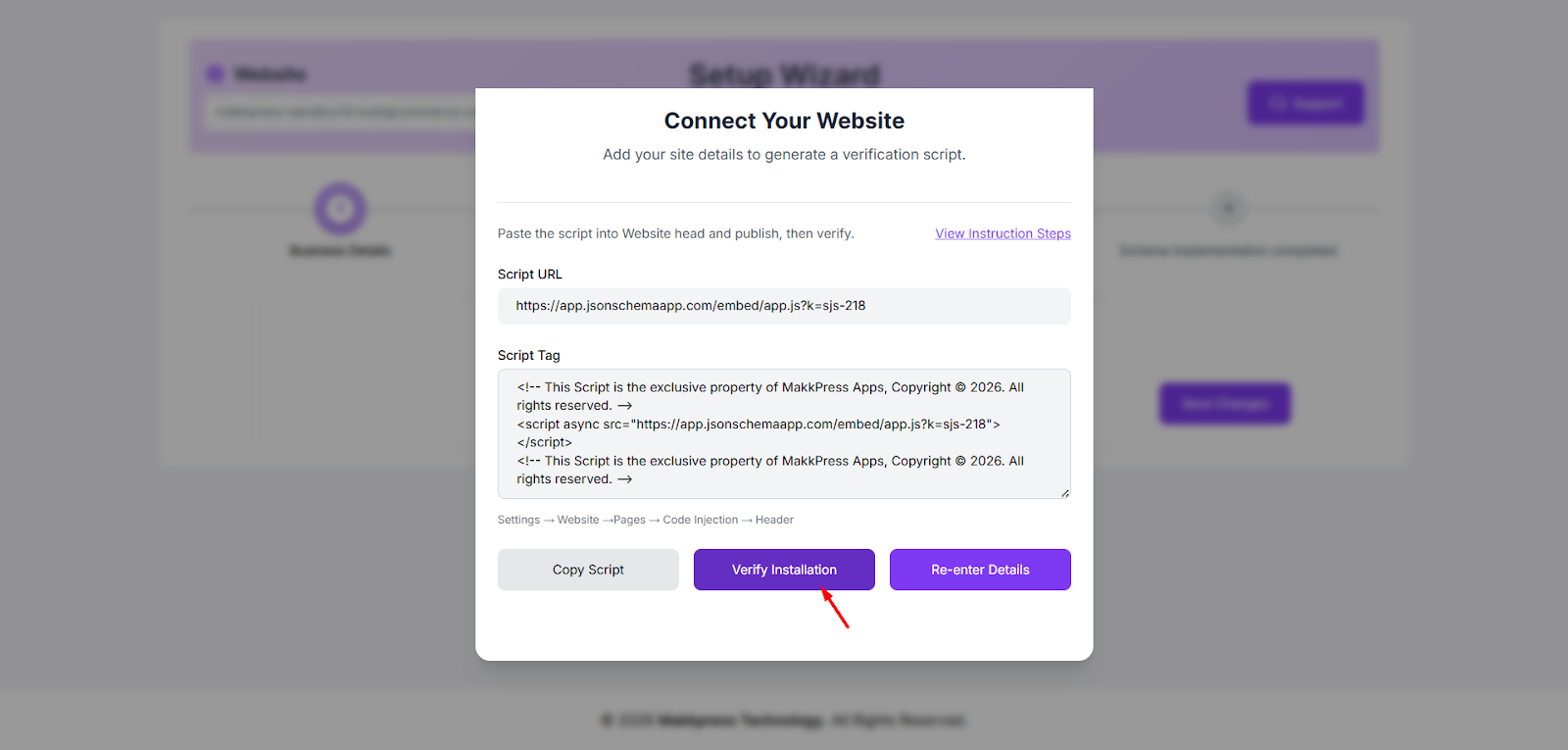 Step 7: Return to the JSON Schema App dashboard and click “Verify Installation” to confirm the script is installed correctly.