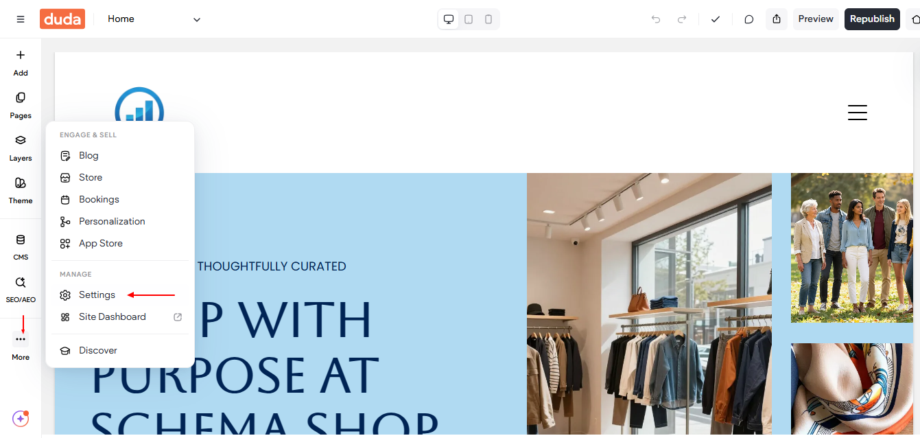 Step 4: Log in to your Duda dashboard, go to More → Settings to add new code.