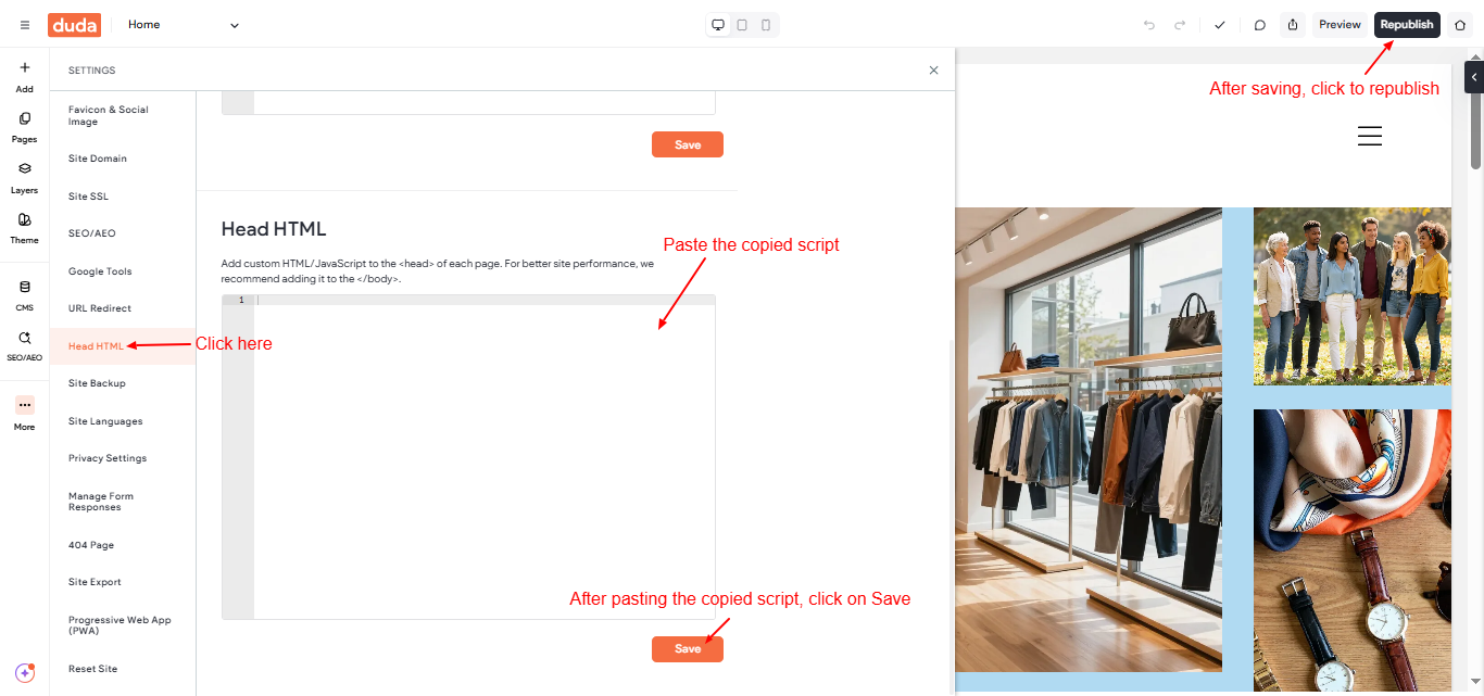 Step 5: Paste the copied script into the Head HTML section, and click Save. After saving, click the Republish button to apply the changes live on your website.