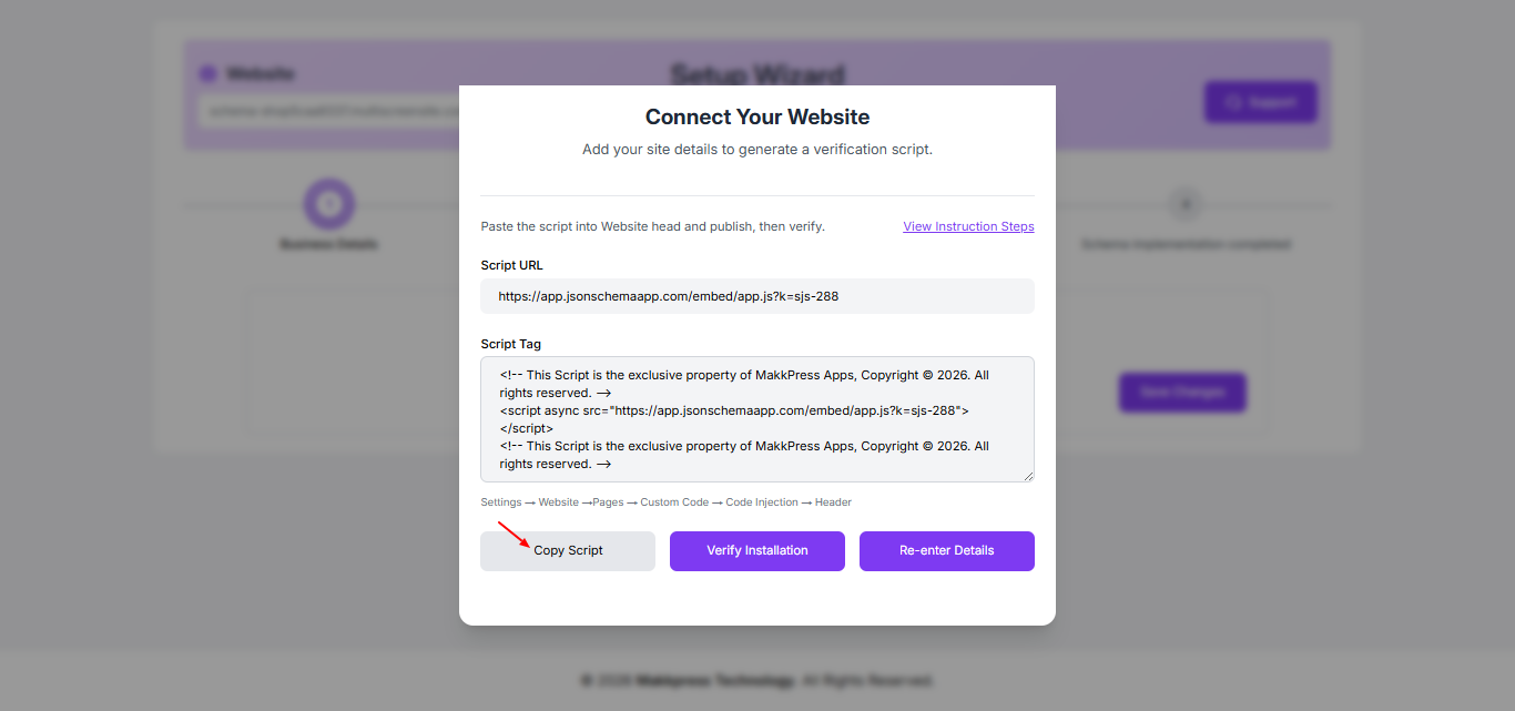 Step 3: In the Setup Wizard, copy the generated script tag by clicking “Copy Script.” This script will be added to your Duda website.