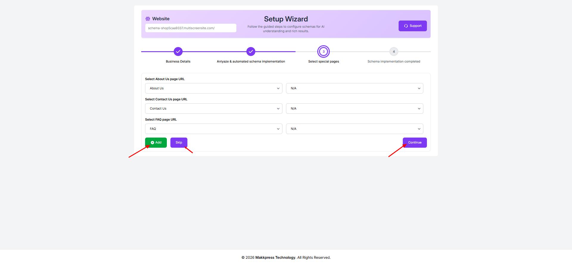Step 12: Select important pages like About Us, Contact Us, and FAQ from the dropdown options. You can add more pages or skip optional ones, then click “Continue” to proceed.