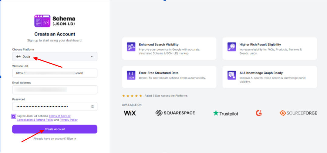 Step 2: Select Duda as your platform, enter your website URL, email address, and create a password. Accept the terms and click “Create Account” to continue.