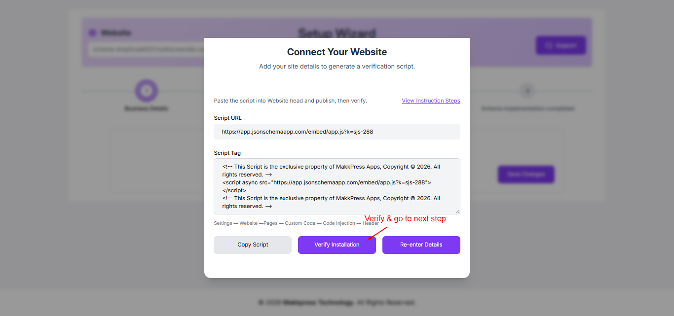 Step 6: Return to the JSON Schema App and click “Verify Installation” to confirm that the script has been successfully added to your Duda website.
