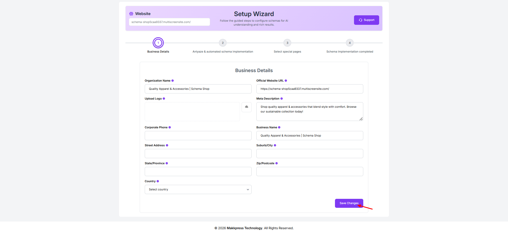 Step 7: Enter your business details such as organization name, website URL, logo, description, contact information, and address. Then click “Save Changes” to proceed.