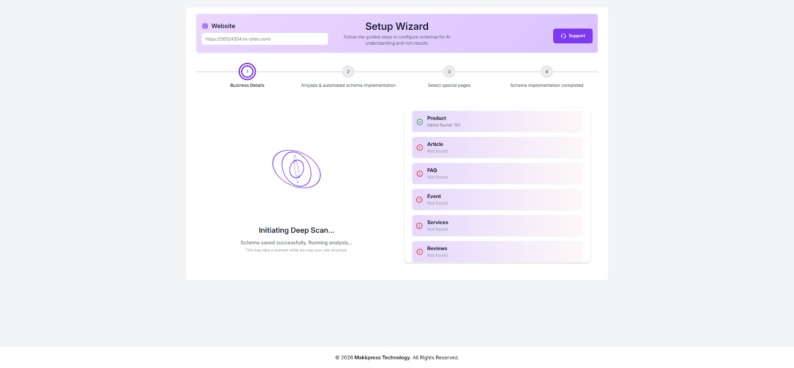 Step 8: After saving your business details, the tool will automatically start a deep scan of your website to analyze existing schema and identify missing elements.