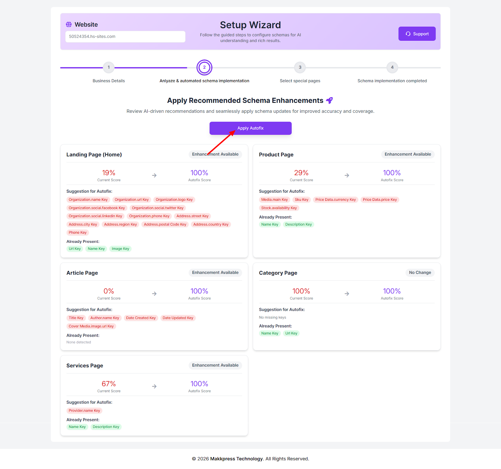 Step 9: Once the analysis is complete, review the recommended schema improvements and click “Apply Autofix” to automatically implement enhancements across your pages.