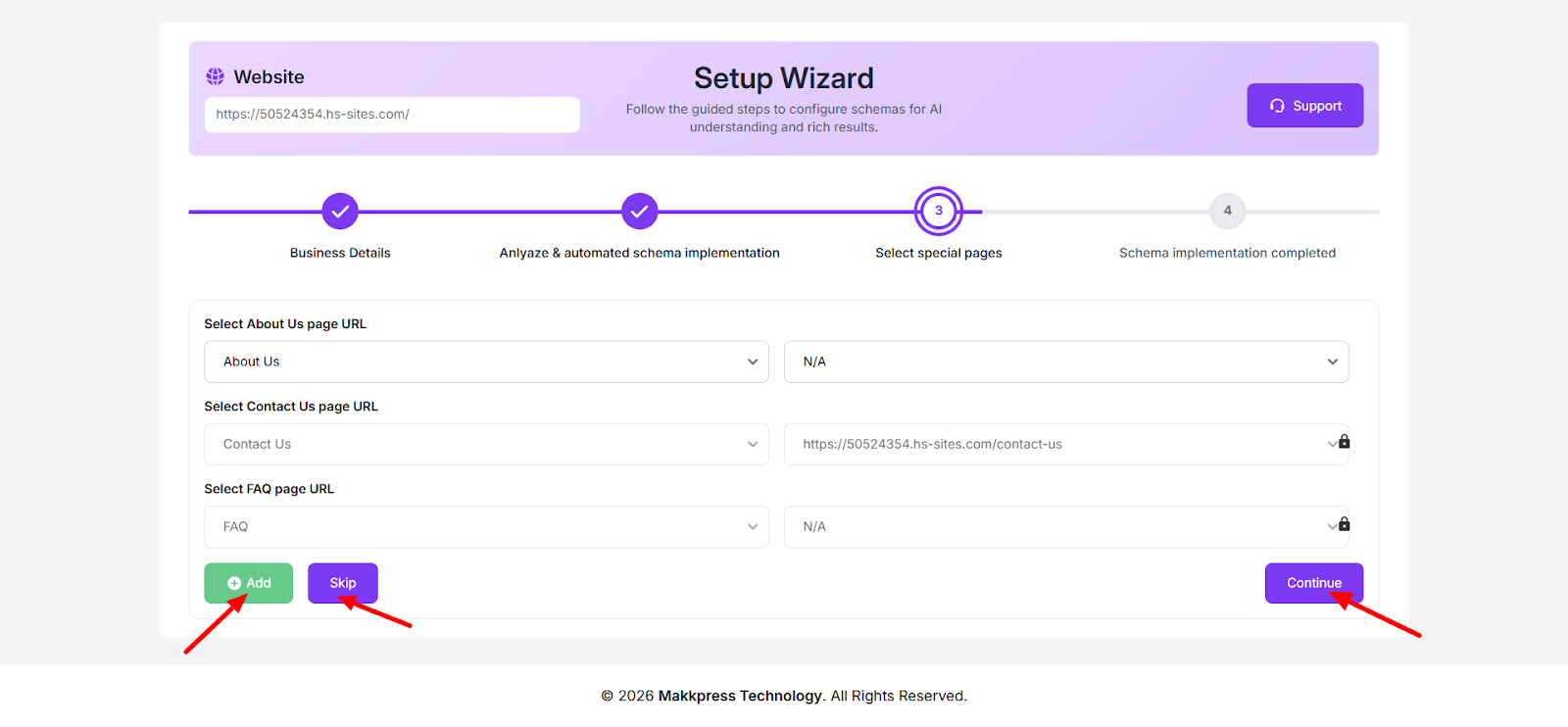 Step 11: Select key pages like About, Contact, and FAQ from your HubSpot website for targeted schema implementation. You can skip this step if not required, then click Continue.