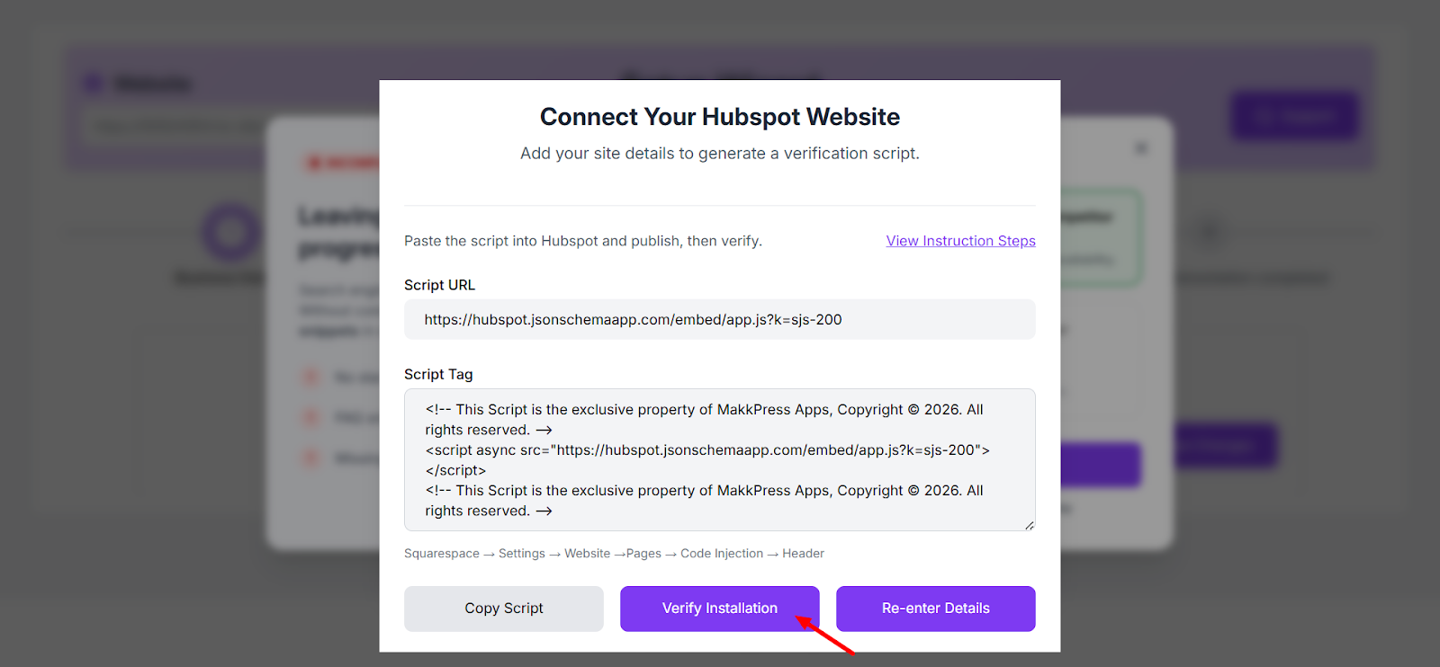 Step 6: After adding the script to your HubSpot website, return to the verification screen and click “Verify Installation”. This will confirm whether the script has been successfully installed and is working correctly on your HubSpot site.