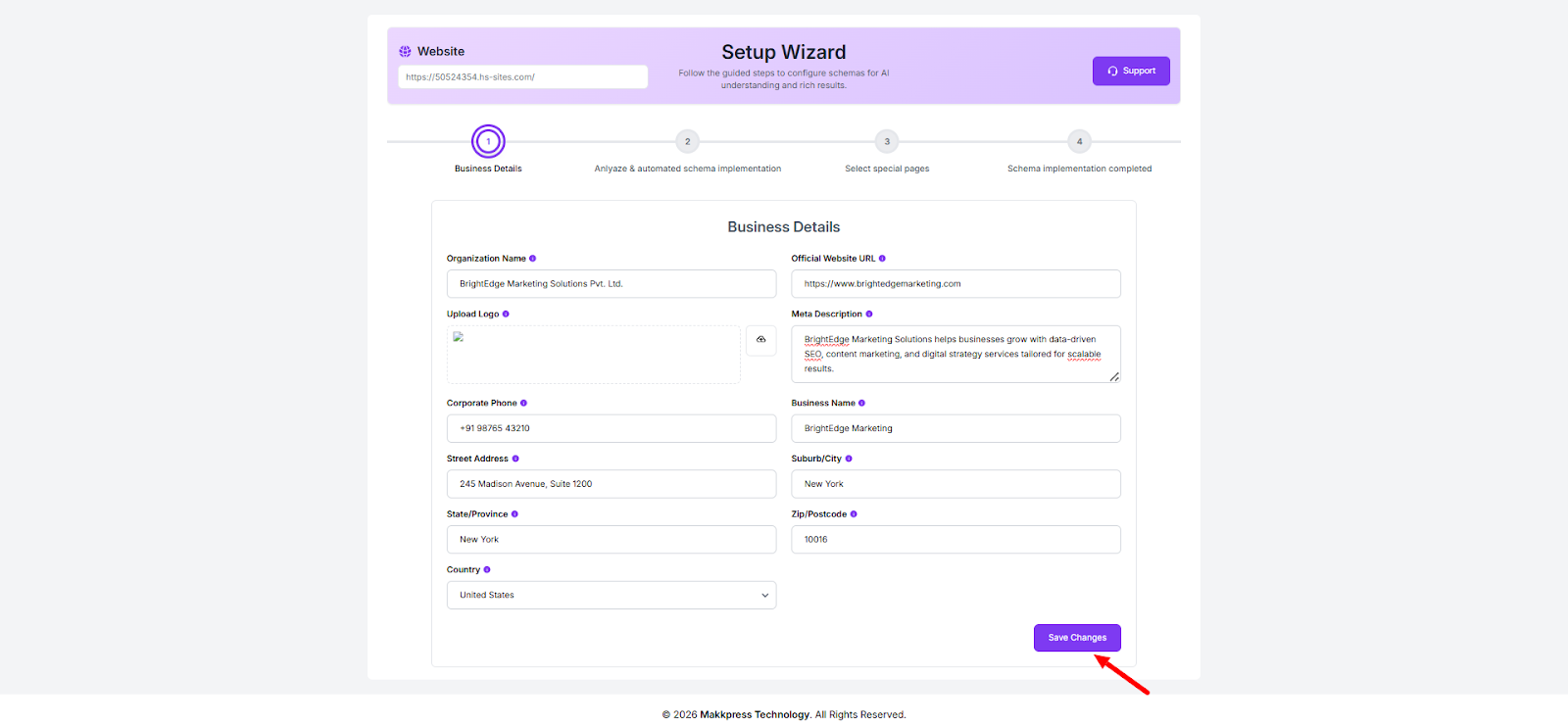 Step 7: In the Setup Wizard, fill in your Business Details including organization name, website URL, meta description, contact information, and address. Once all the required fields are completed, click “Save Changes” to proceed to the next step.