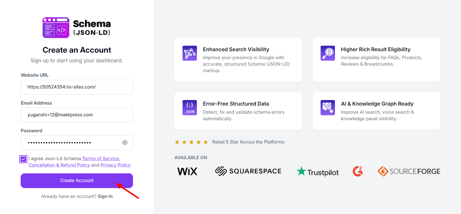 Step 2: Enter your website URL and email address, then create a password to set up your account. Once all the details are filled in, click “Create Account” to continue.