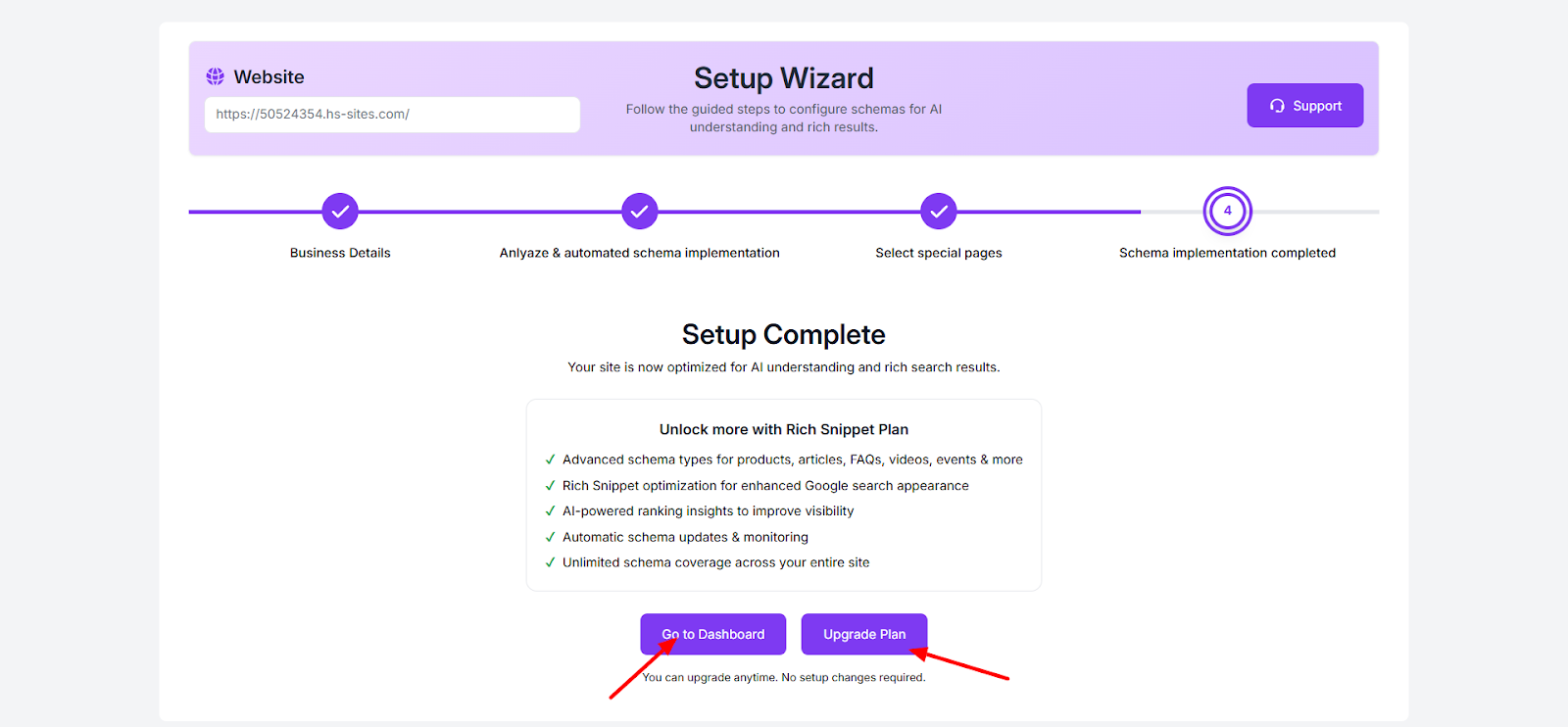 Step 12: Click “Go to Dashboard” to manage your schema settings, or choose “Upgrade Plan” to access advanced features and enhanced rich results.