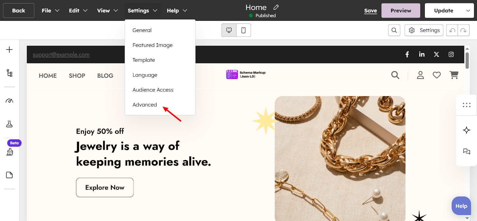 Step 4: Log in to your HubSpot Account and open your website dashboard. Click on the Settings and go to “Advanced”.