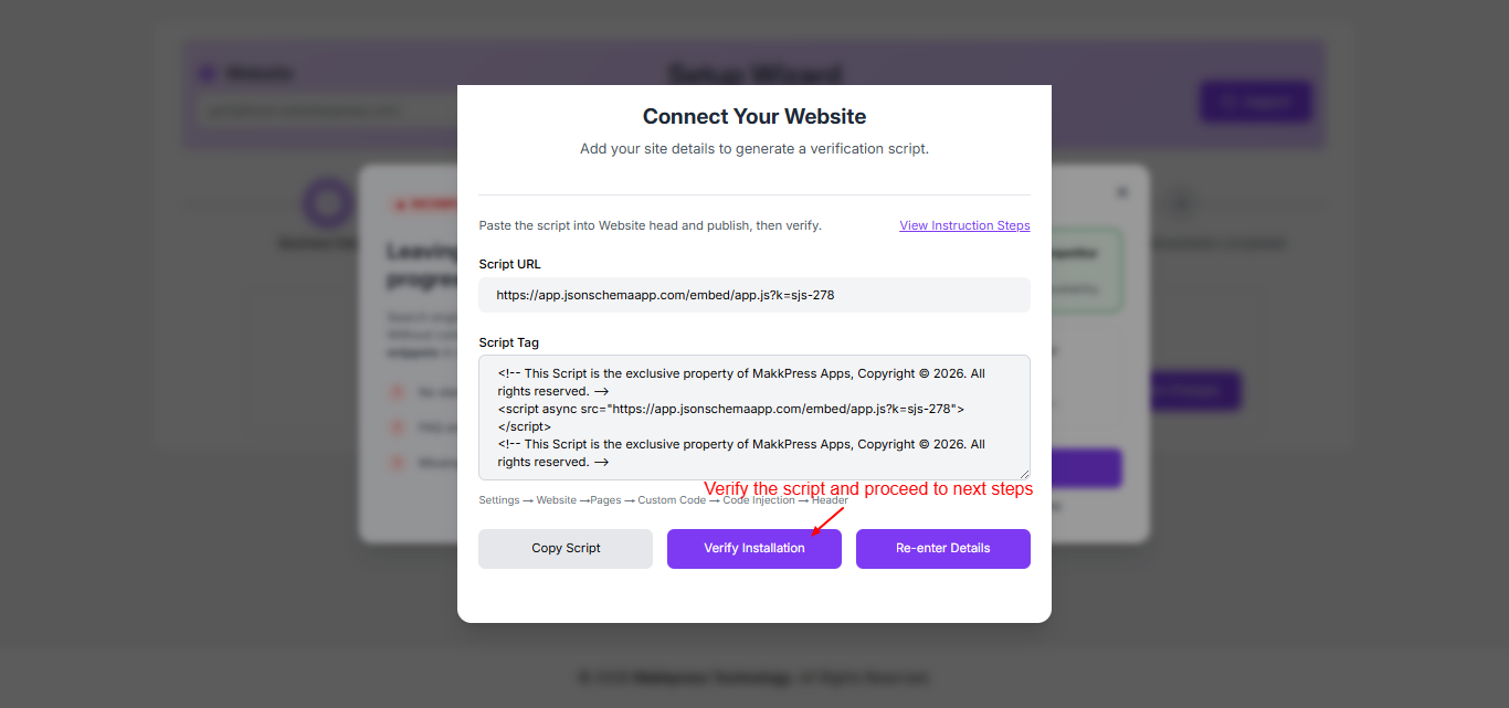 Step 5: Return to the JSON Schema App and click “Verify Installation” to confirm that the script has been successfully added to your Webflow website.