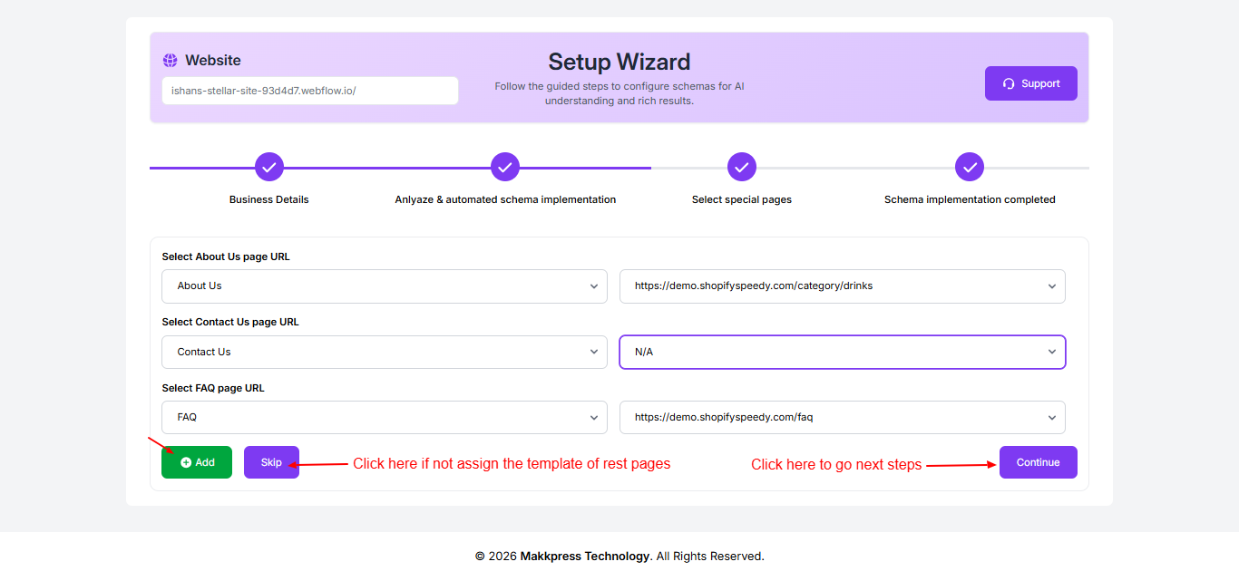 Step 10: Select important page URLs like About Us, Contact Us, and FAQ from the dropdowns. You can add more pages or skip optional ones, then click “Continue” to proceed.