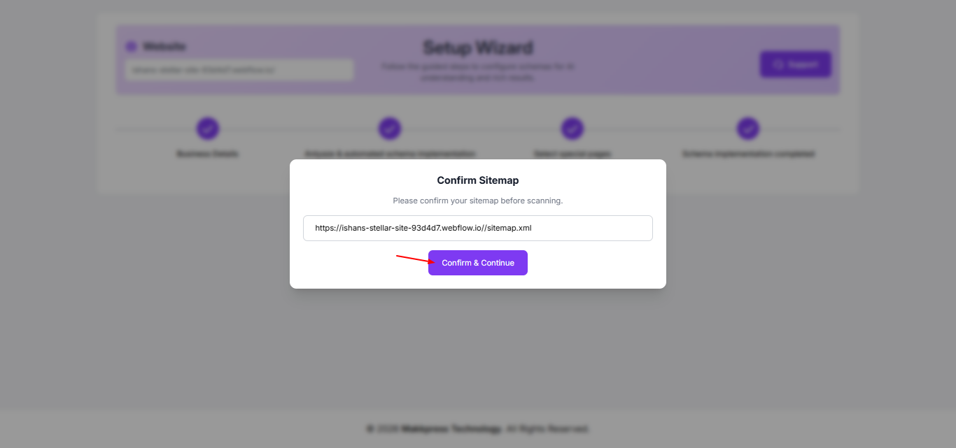 Step 7: Confirm your website sitemap URL and click “Confirm & Continue” to allow the tool to scan your Webflow website.