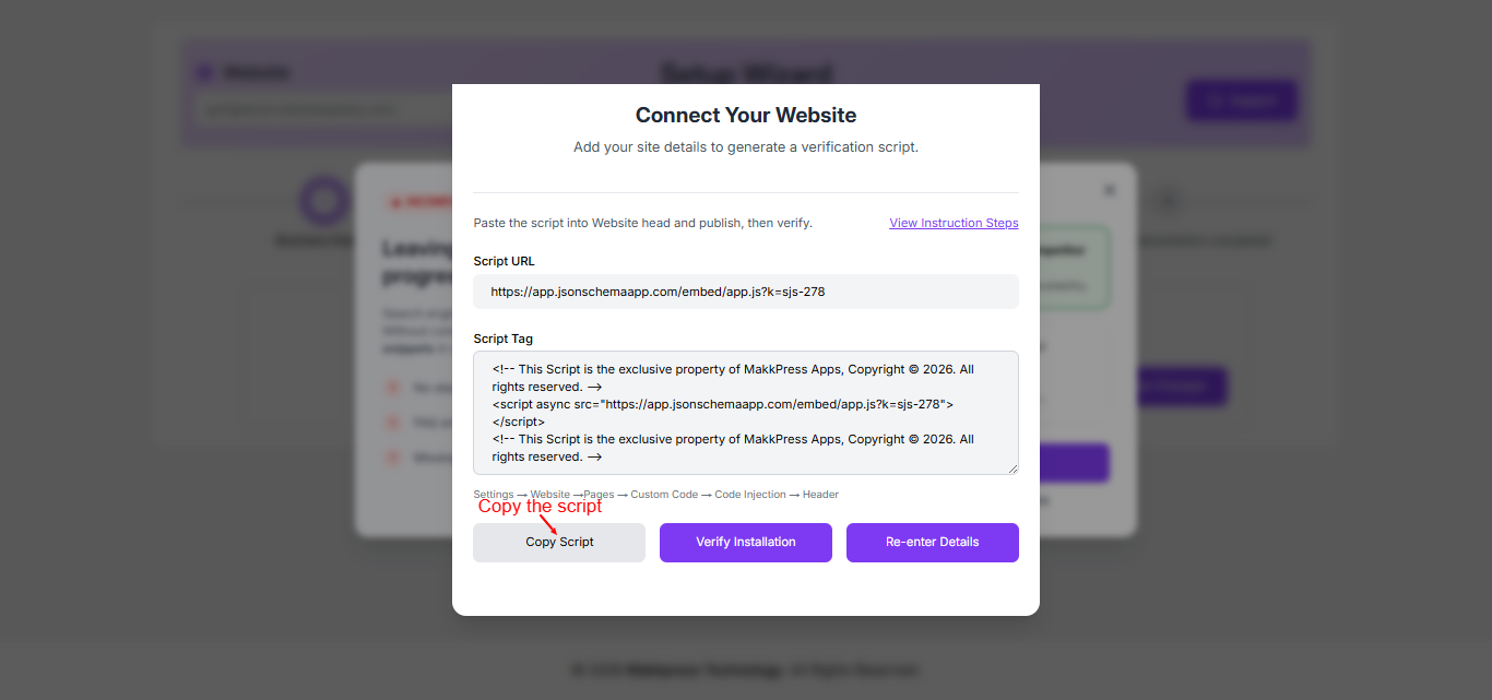 Step 3: In the setup screen, click “Copy Script” to copy the generated script. This code will be added to your Webflow website for integration.