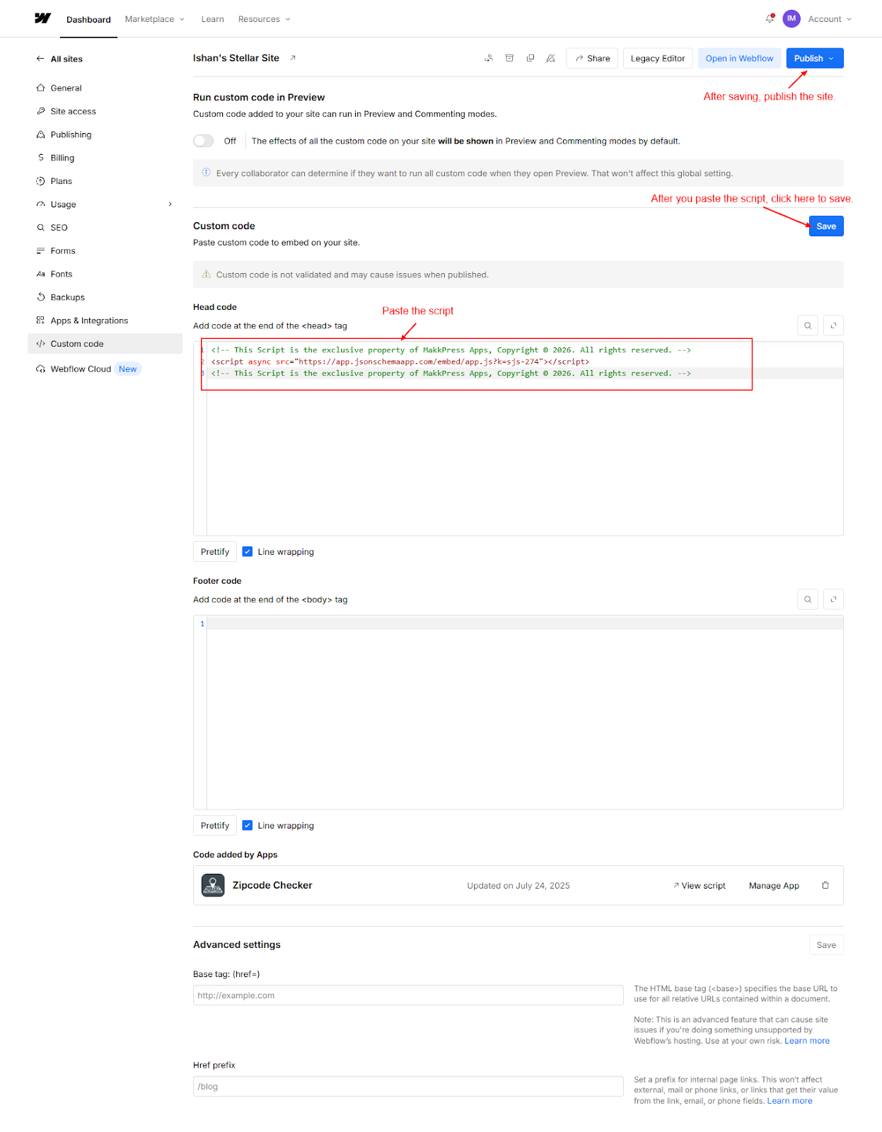 Step 4: Log in to your Webflow dashboard, go to Site Settings → Custom Code, and paste the copied script inside the Head code section. Click Save, then Publish your site to apply the changes.