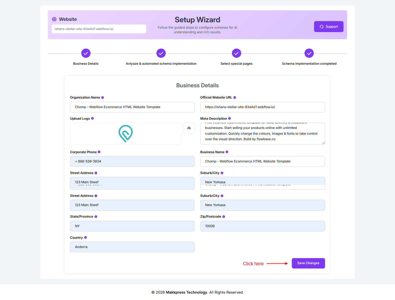 Step 6: Enter your business details such as organization name, website URL, logo, description, contact information, and address. Once completed, click “Save Changes” to continue.