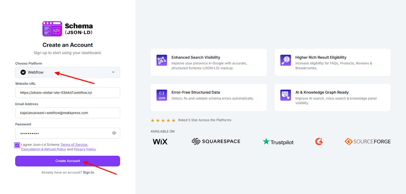 Step 2: Select Webflow as your platform, enter your website URL, email address, and create a password. Accept the terms and click “Create Account” to continue.