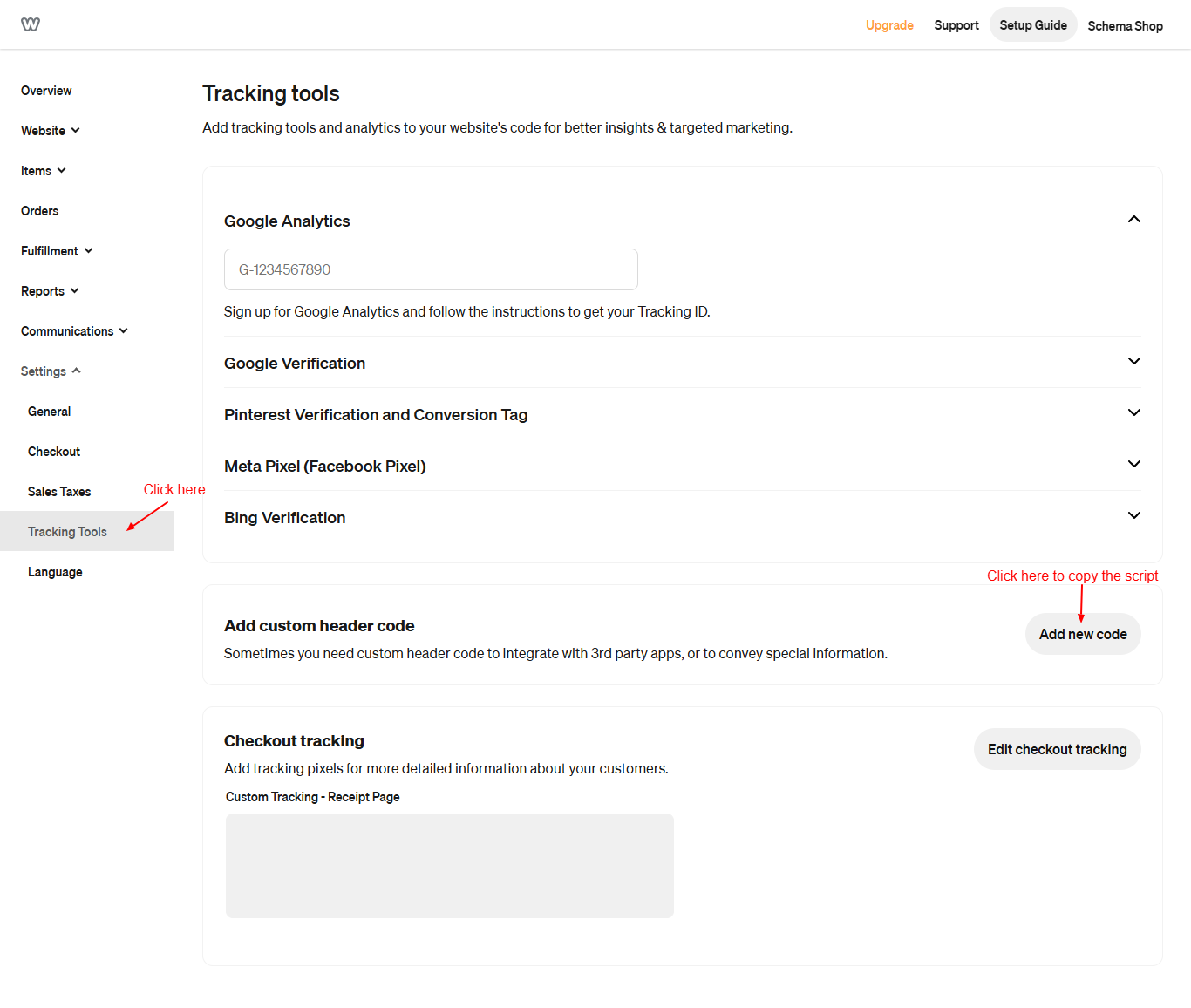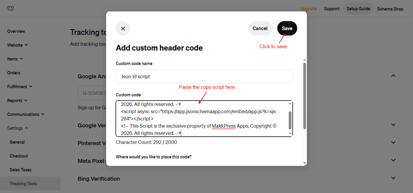 Step 4: Log in to your Weebly dashboard, go to Settings → Tracking Tools, click “Add new code”, and paste the copied script in the header section. Save the changes to apply the code.