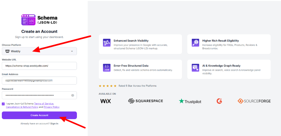 Step 2: Select Weebly as your platform, enter your website URL, email address, and create a password. Accept the terms and click “Create Account” to continue.