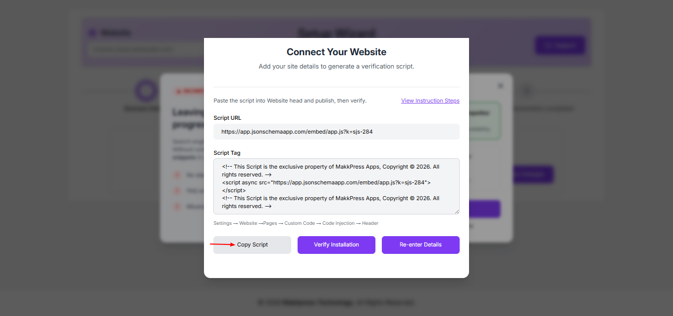 Step 3: In the setup screen, click “Copy Script” to copy the generated script. This code will be added to your Weebly website.