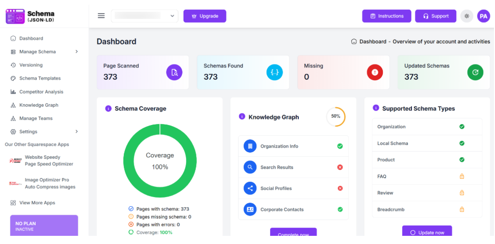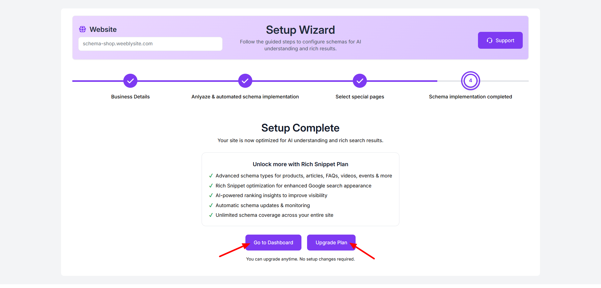 Step 14: Your setup is now complete. Click “Go to Dashboard” to manage your schema settings or choose “Upgrade Plan” to access additional features.