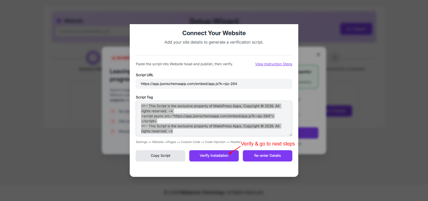 Step 6: Return to the JSON Schema App and click “Verify Installation” to confirm that the script has been successfully added to your Weebly website.