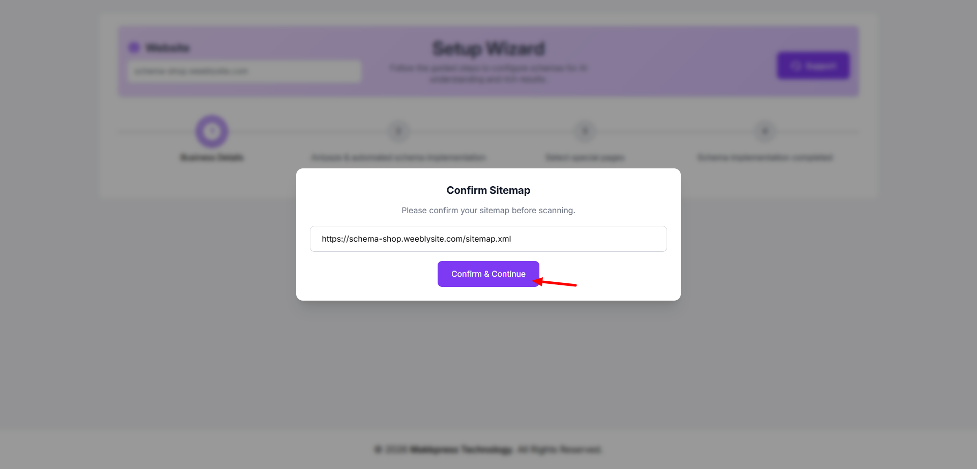 Step 8: Confirm your website sitemap URL and click “Confirm & Continue” to allow the tool to scan your Weebly website.