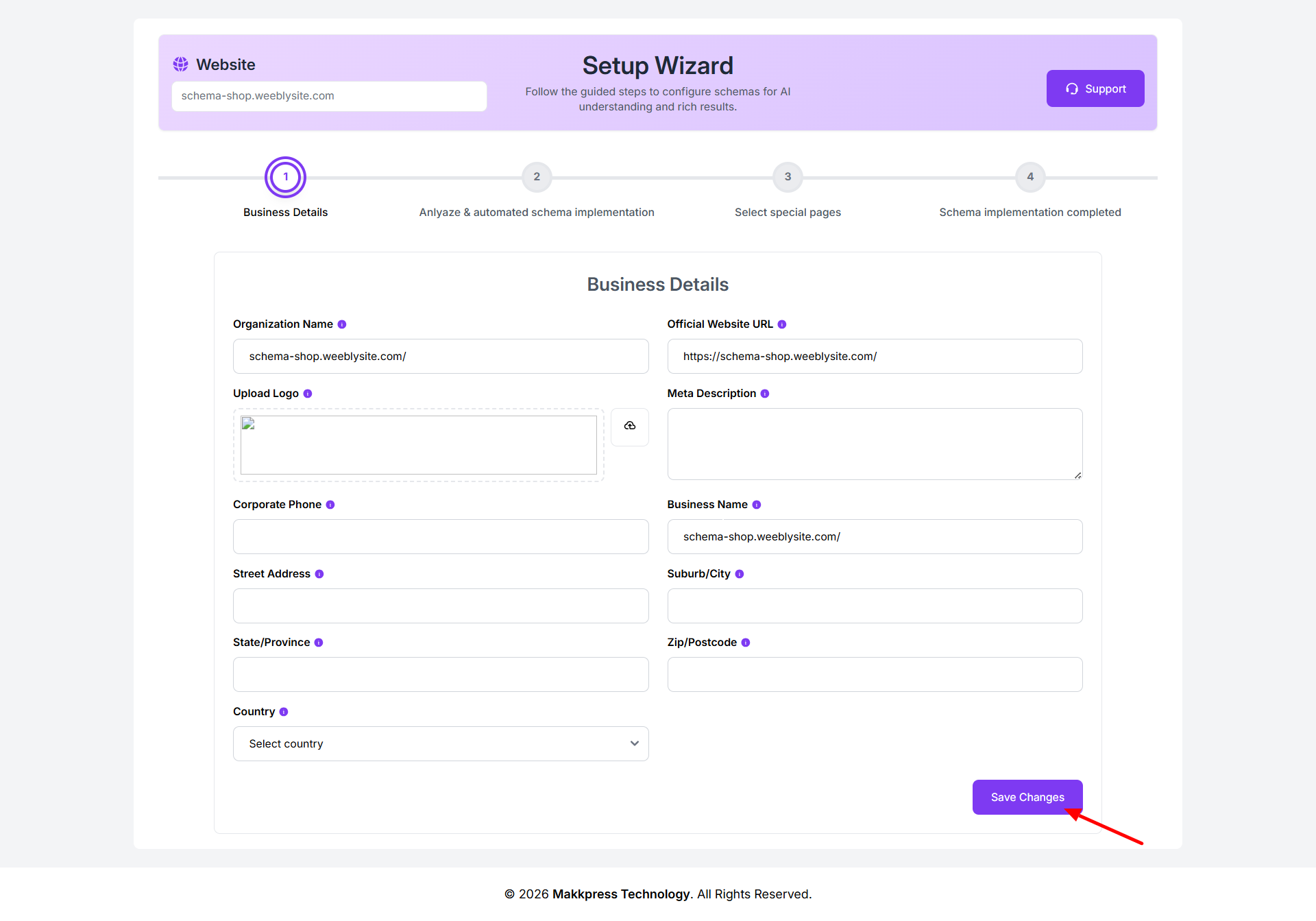 Step 7: Enter your business details such as organization name, website URL, logo, description, contact information, and address. Then click “Save Changes” to proceed.