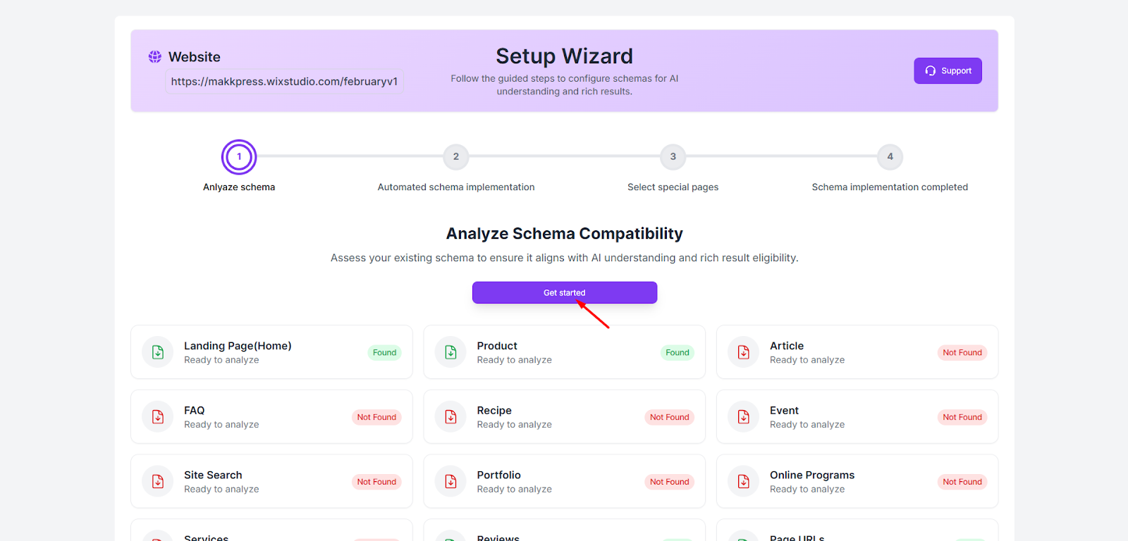 Step 6: You will be redirected to the Setup Wizard page. Click “Get Started” to begin analyzing the existing schema on your website.