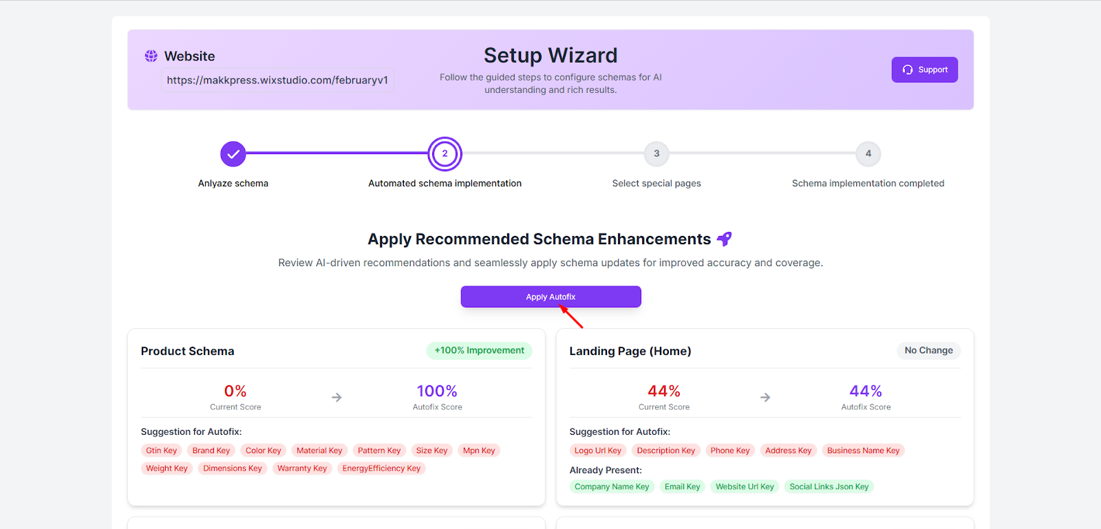 Step 7: After the analysis, the wizard shows your current schema score and the improved score after optimization. Click “Apply Autofix” to automatically apply the recommended schema improvements.