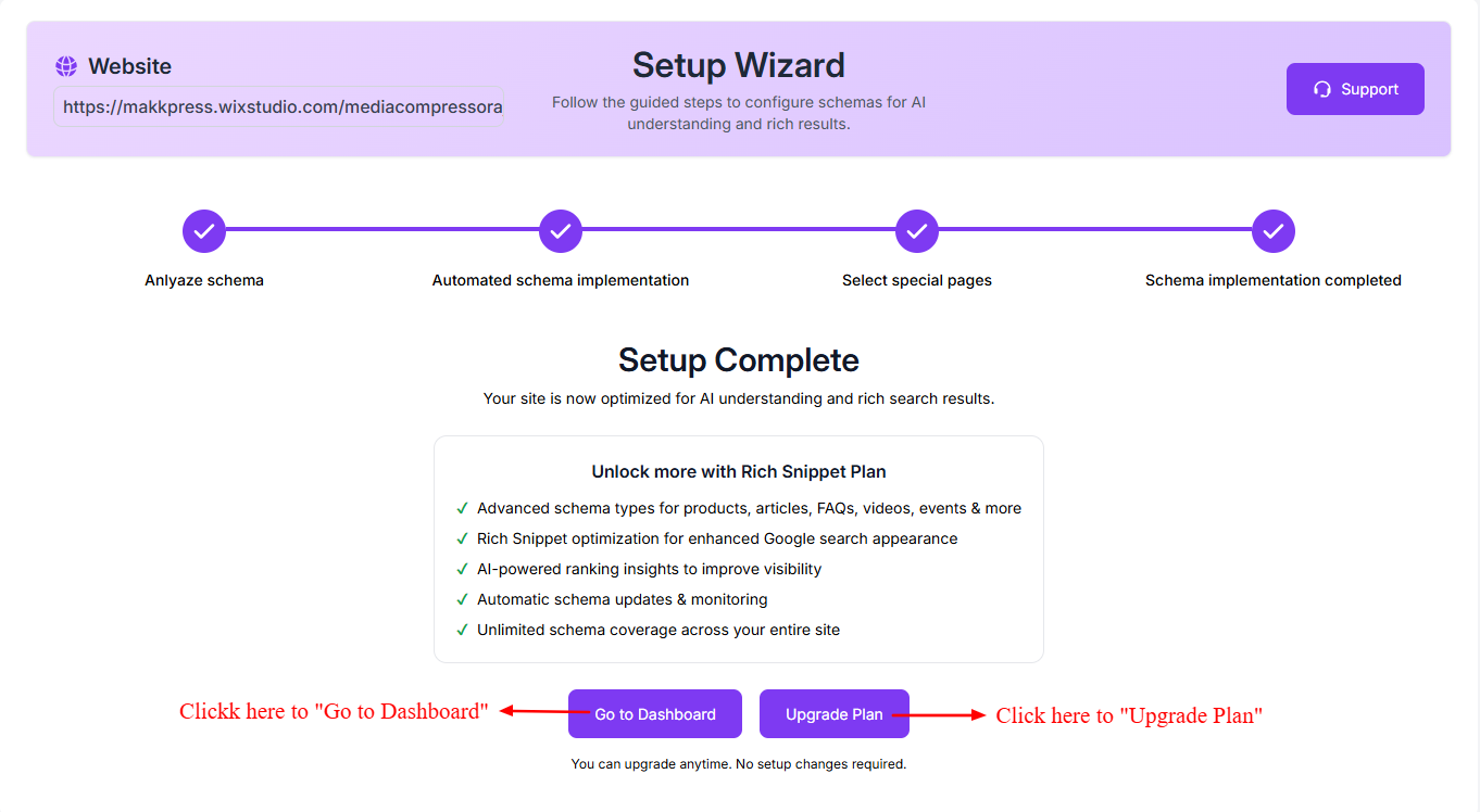 Step 9: Your schema setup is now complete. Click “Go to Dashboard” to manage your schema settings and monitor your website schema. You can also click “Upgrade Plan” to unlock advanced schema features and rich snippet optimization.