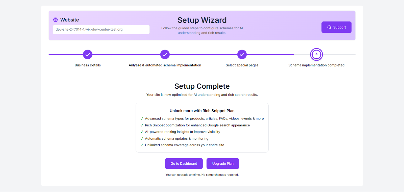 Step 12: Your schema setup is now complete. Click “Go to Dashboard” to manage your schema settings, or click “Upgrade Plan” to unlock advanced schema features and rich snippet optimization.