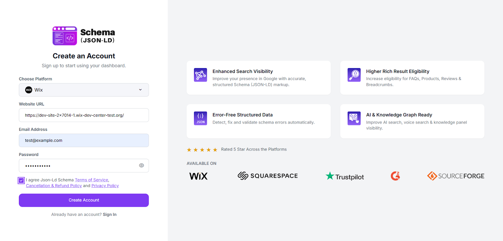 Step 2: Select Wix as your platform, enter your website URL, email address, and create a password. Accept the terms and click “Create Account” to continue.