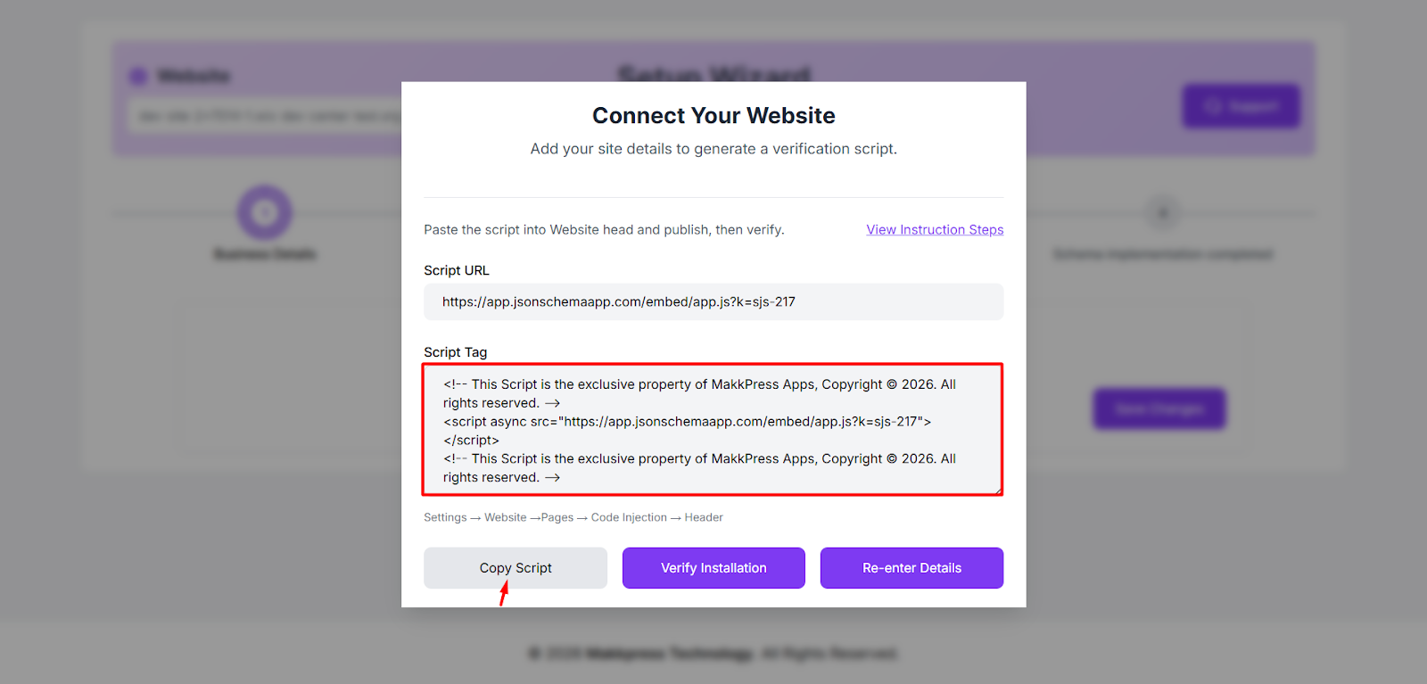 Step 5: Copy the script tag and add it to your Wix website header by following the “View Instruction Steps.” After adding the script, click “Verify Installation.”